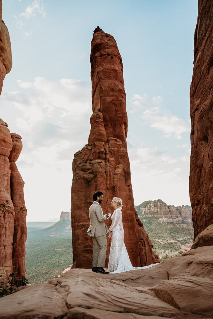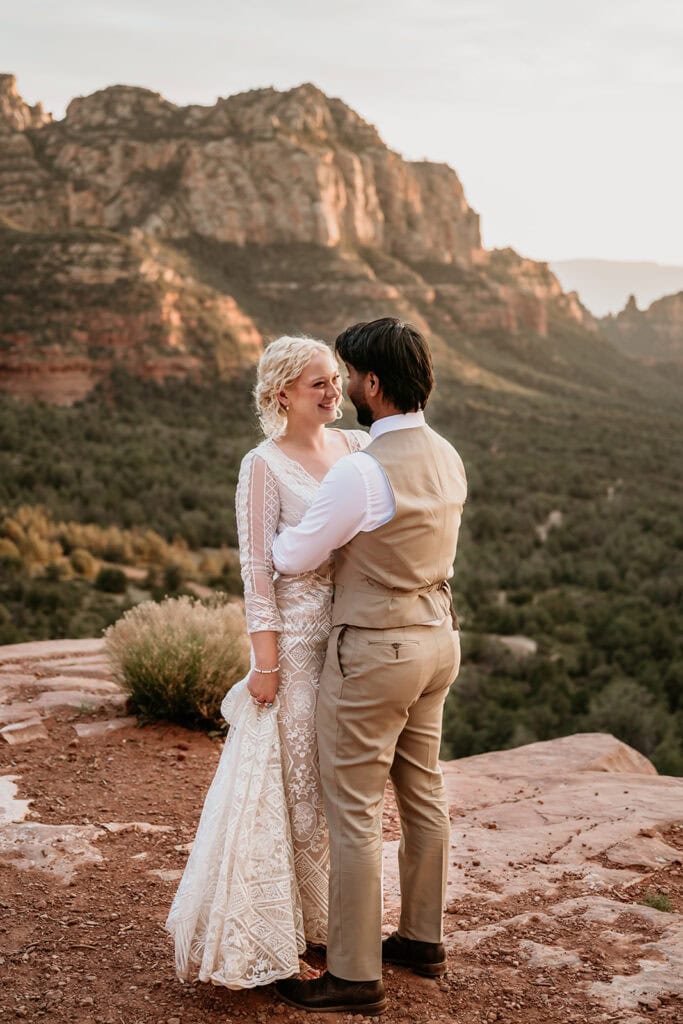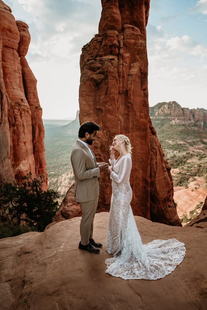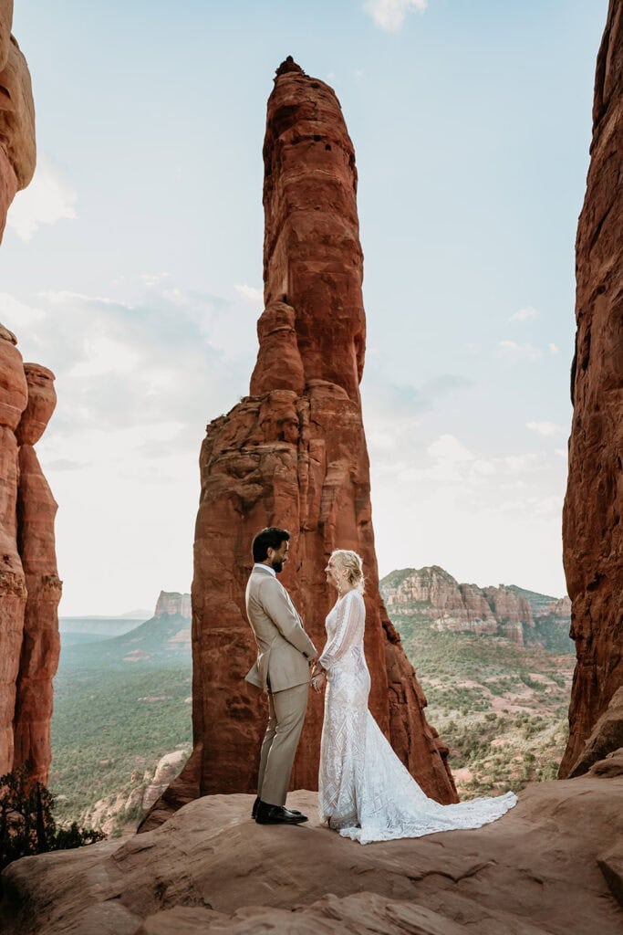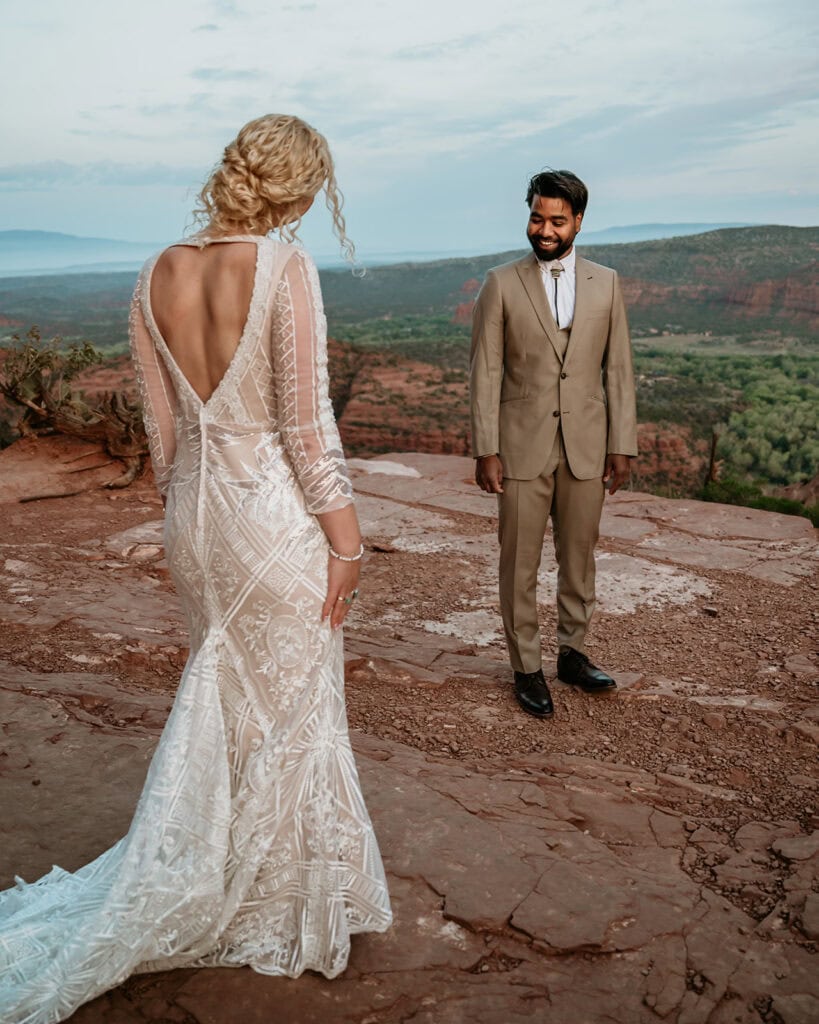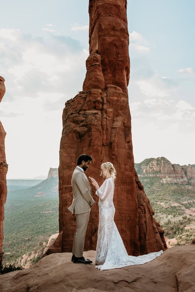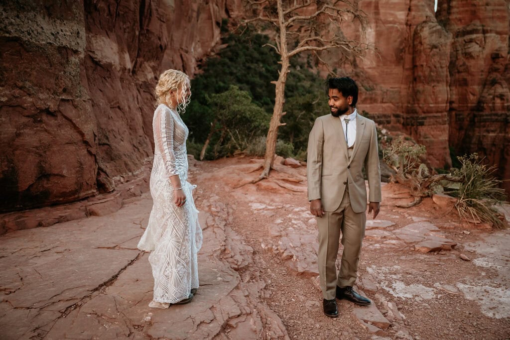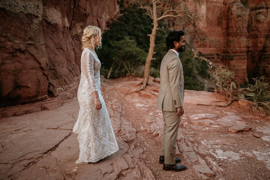 The morning began before sunrise under a sky full of stars. Jillian and Sai hiked up Cathedral Rock in the dark, climbing through the crevice by headlamp as the desert slowly came to life. At the top, as the first rays of sunlight hit the red rocks, they changed into their wedding clothes and shared a quiet first look before exchanging vows near the sunrise spire.
