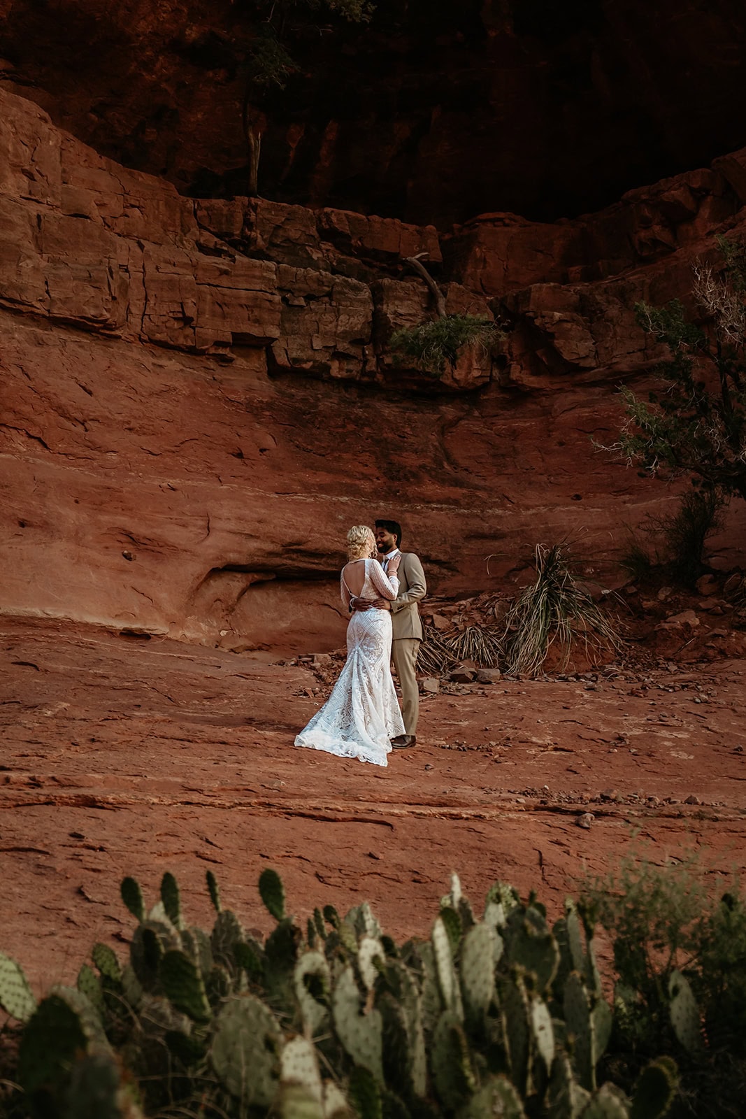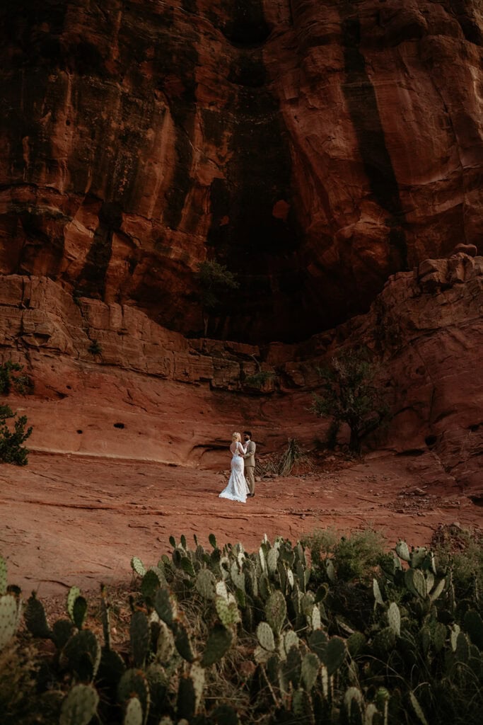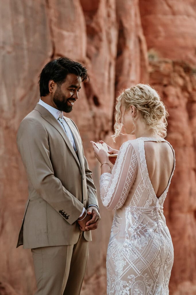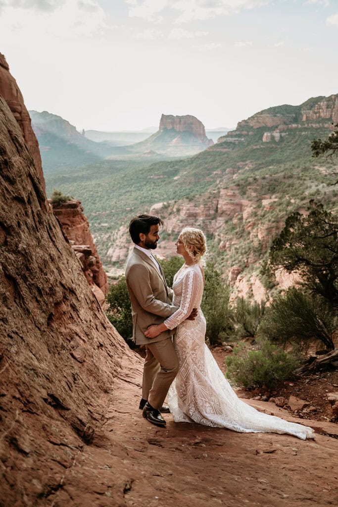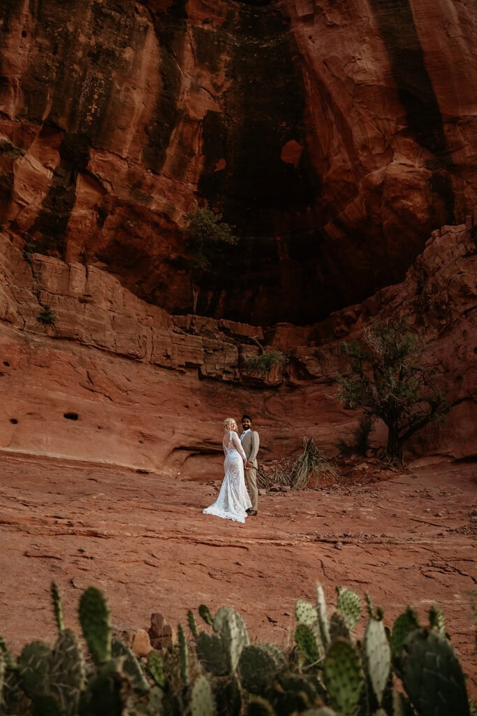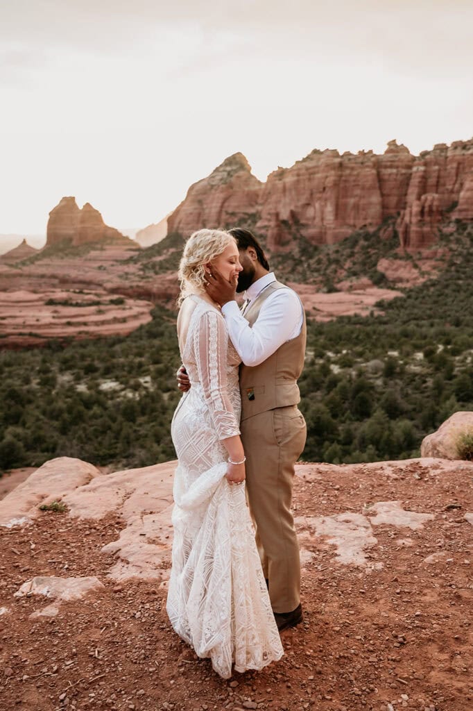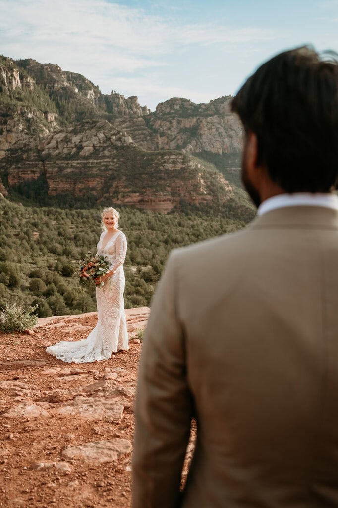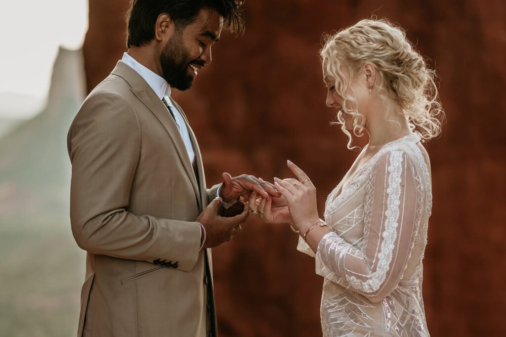 The morning began before sunrise under a sky full of stars. Jillian and Sai hiked up Cathedral Rock in the dark, climbing through the crevice by headlamp as the desert slowly came to life. At the top, as the first rays of sunlight hit the red rocks, they changed into their wedding clothes and shared a quiet first look before exchanging vows near the sunrise spire.