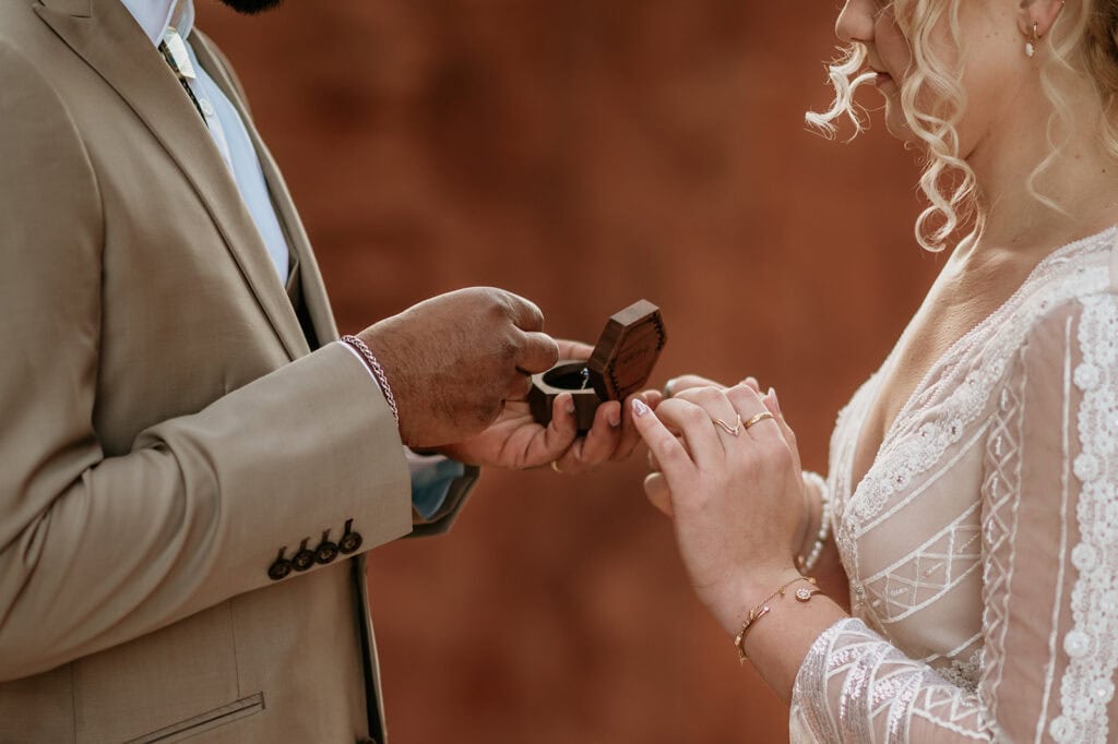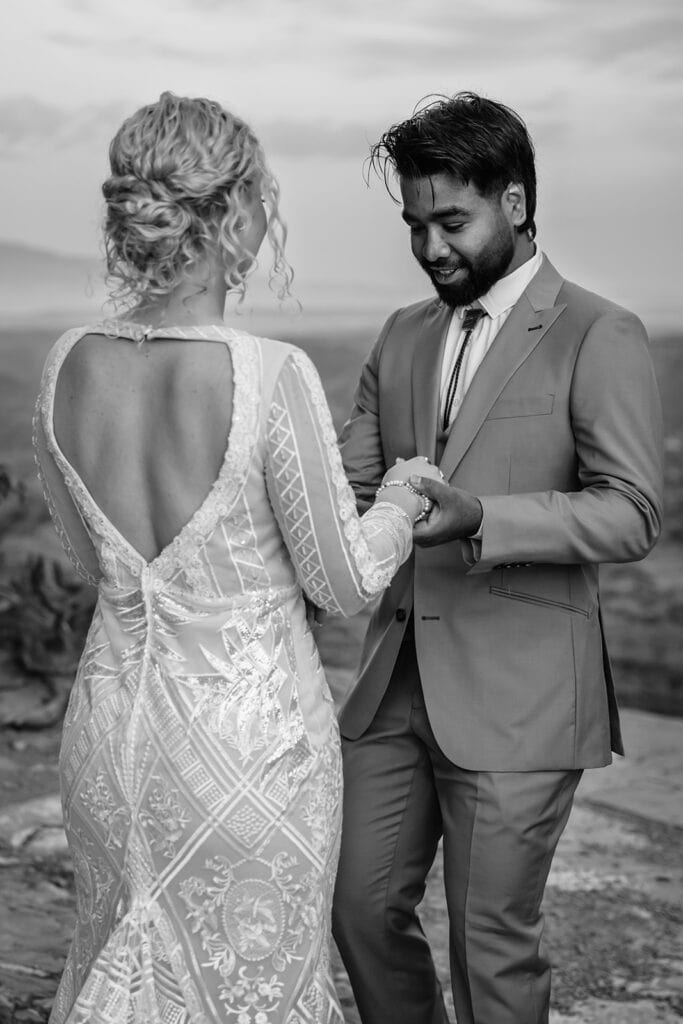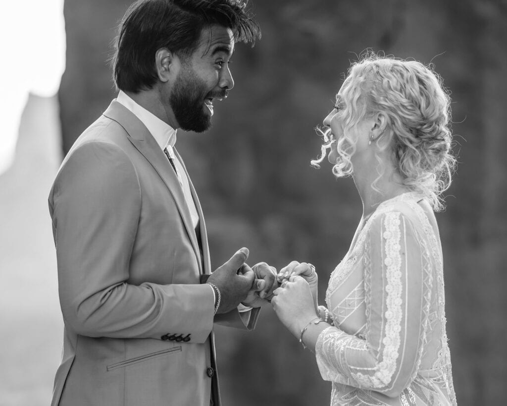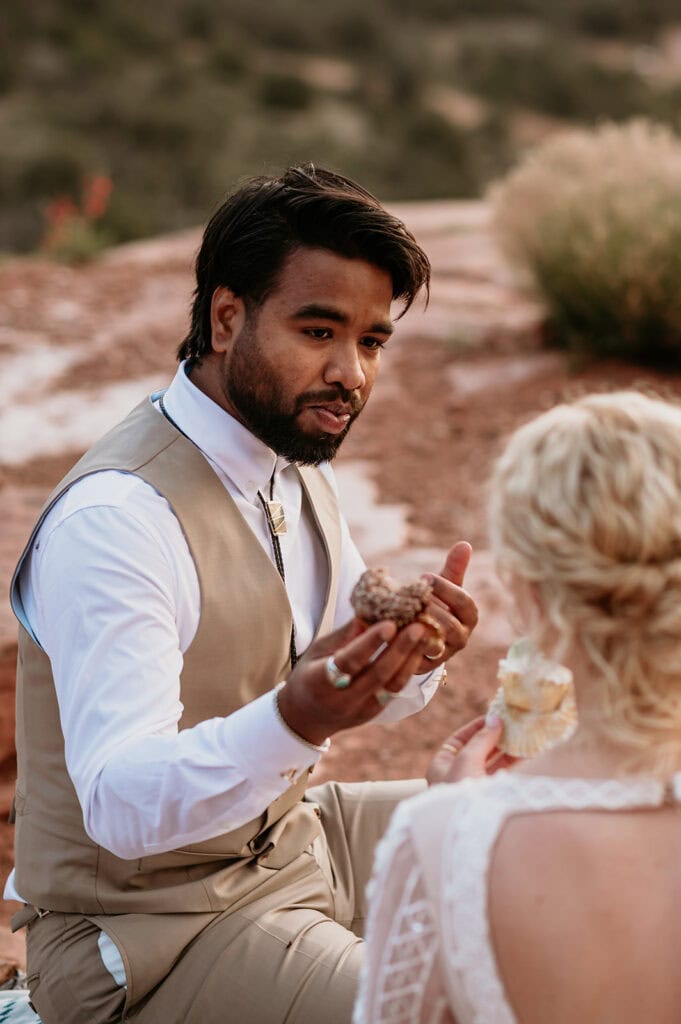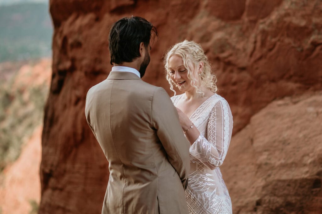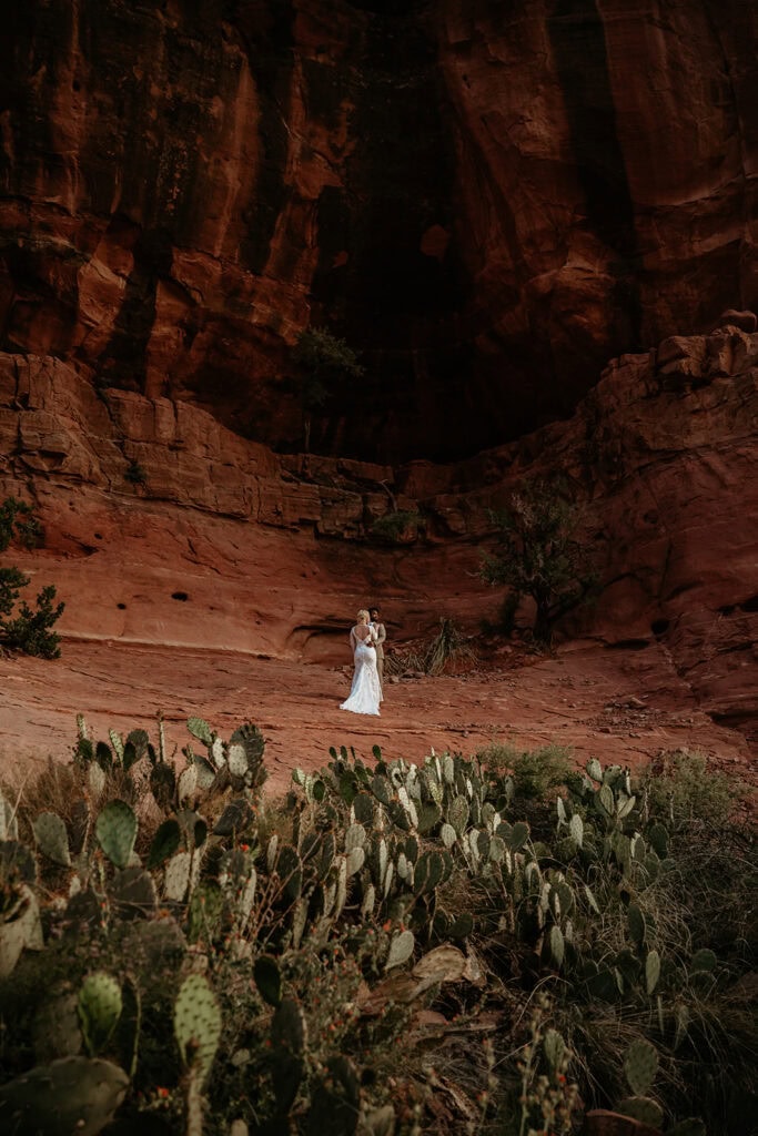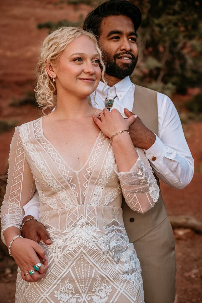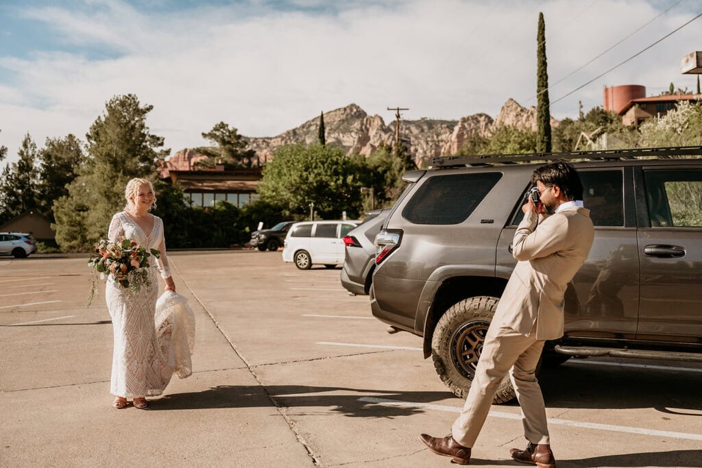 The morning began before sunrise under a sky full of stars. Jillian and Sai hiked up Cathedral Rock in the dark, climbing through the crevice by headlamp as the desert slowly came to life. At the top, as the first rays of sunlight hit the red rocks, they changed into their wedding clothes and shared a quiet first look before exchanging vows near the sunrise spire.