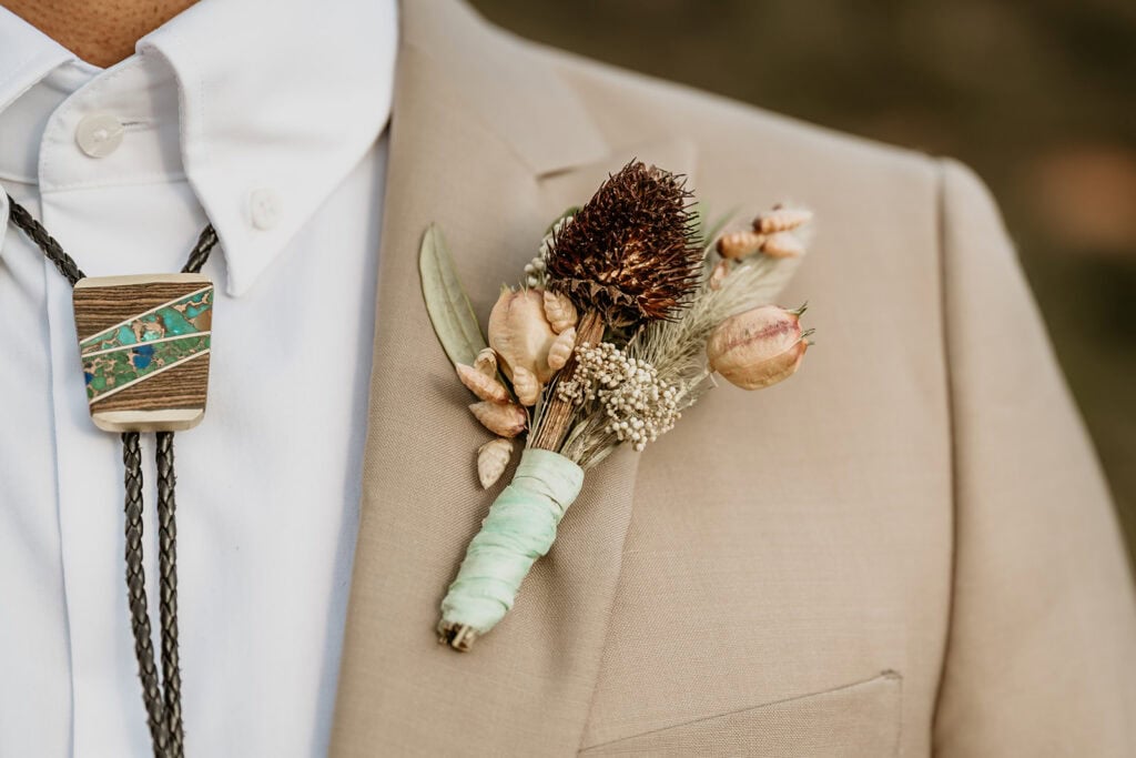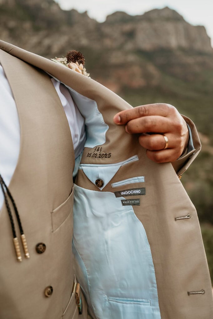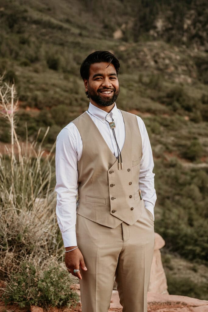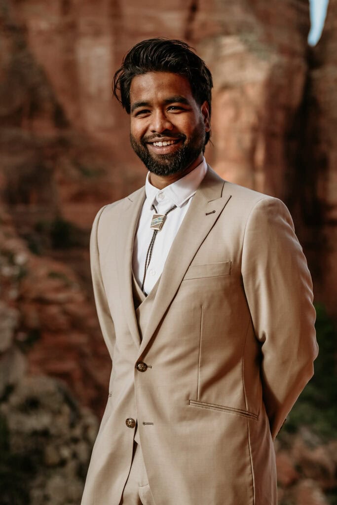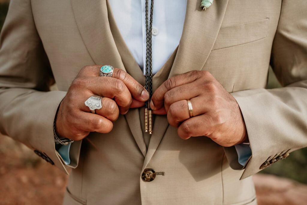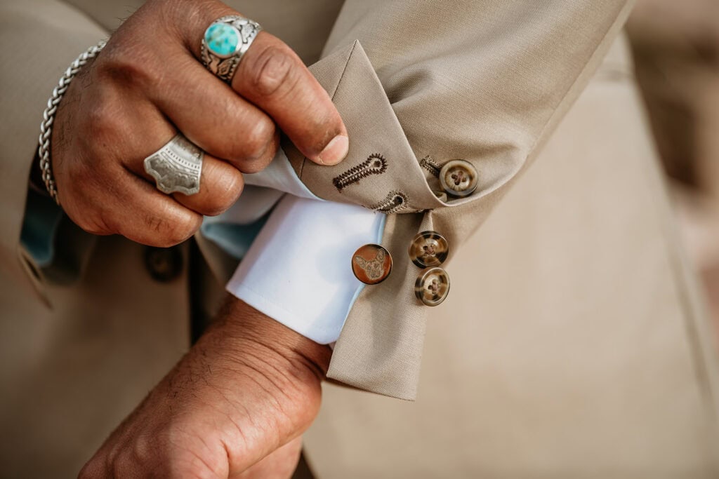 Jillian’s long-sleeved beaded gown caught the early light in the most unreal way, and her turquoise jewelry mirrored her bright blue eyes. Ash from Desert Sage Hair and Makeup styled her hair into soft blonde curls that fit the desert breeze perfectly. Sai wore a tan suit with a bolo tie and vest, a look that nodded to the Southwest vibe they both love.