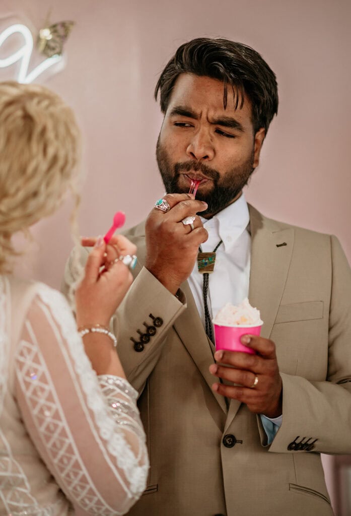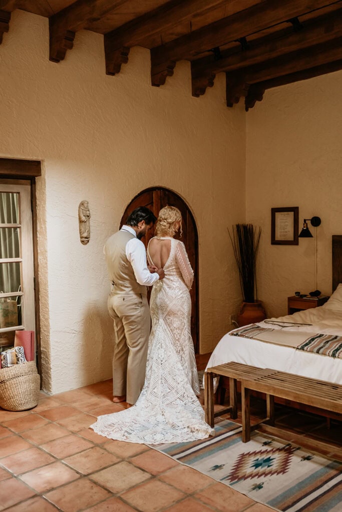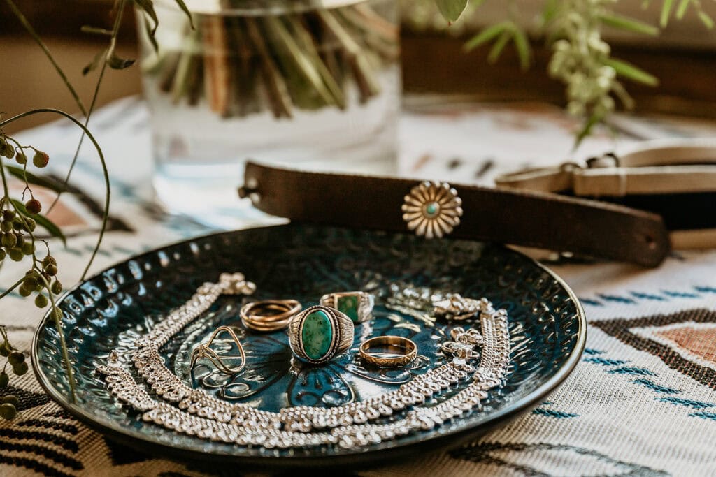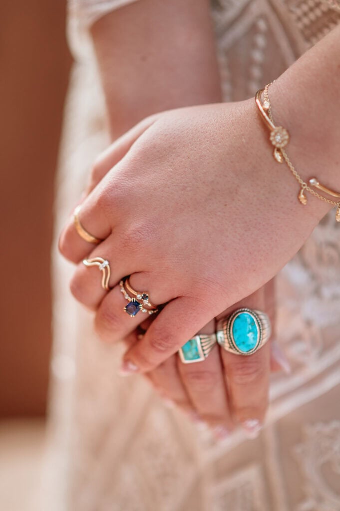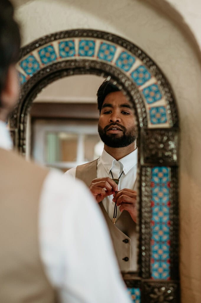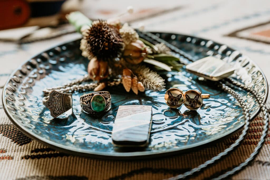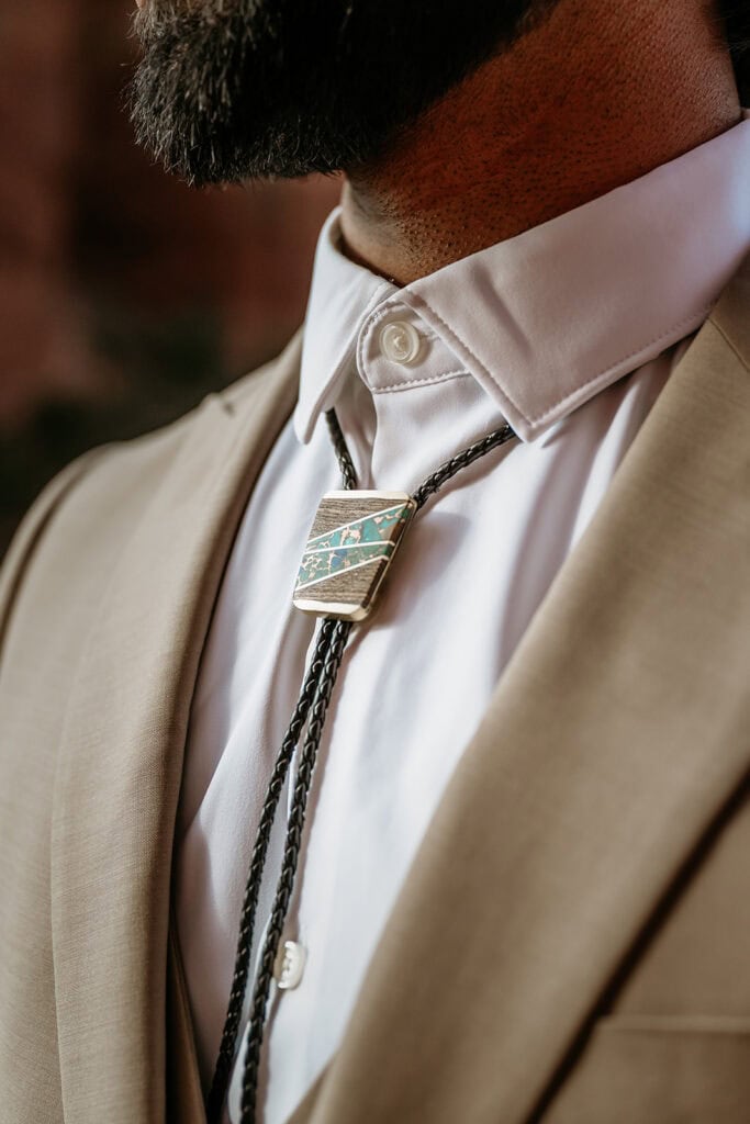 Jillian’s long-sleeved beaded gown caught the early light in the most unreal way, and her turquoise jewelry mirrored her bright blue eyes. Ash from Desert Sage Hair and Makeup styled her hair into soft blonde curls that fit the desert breeze perfectly. Sai wore a tan suit with a bolo tie and vest, a look that nodded to the Southwest vibe they both love.