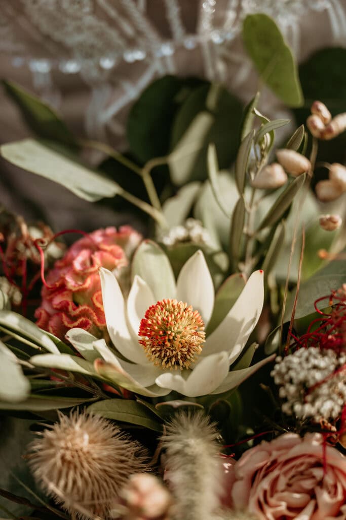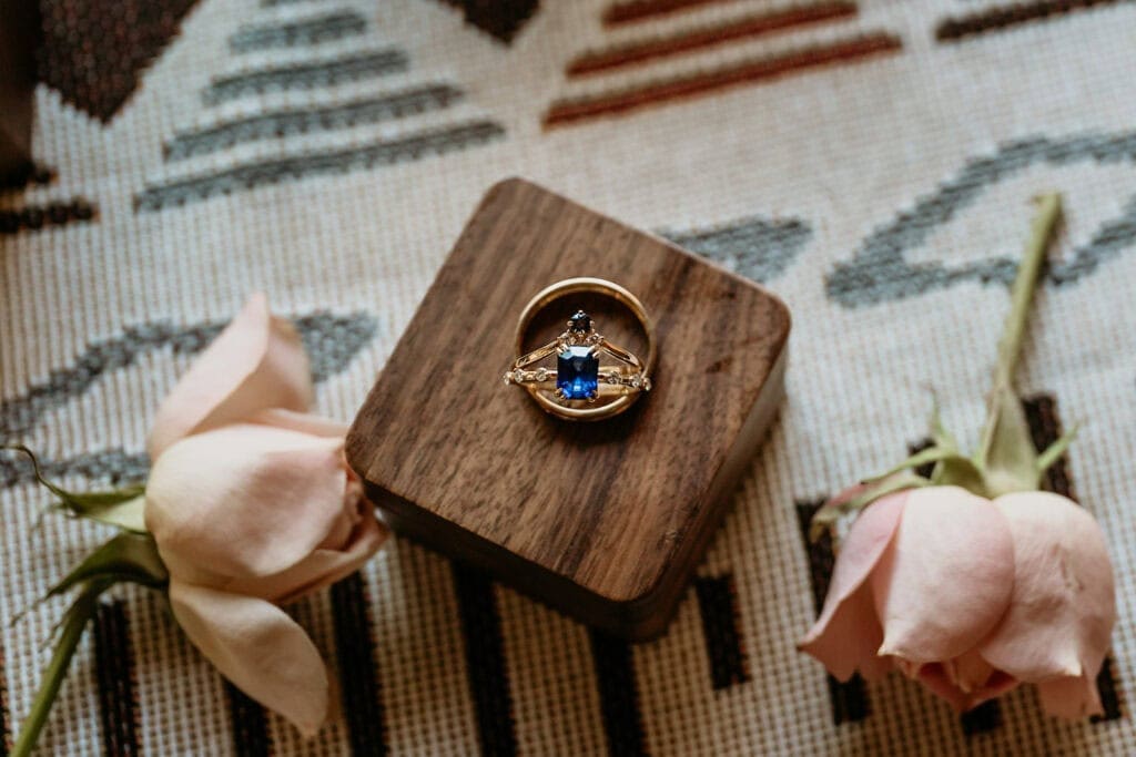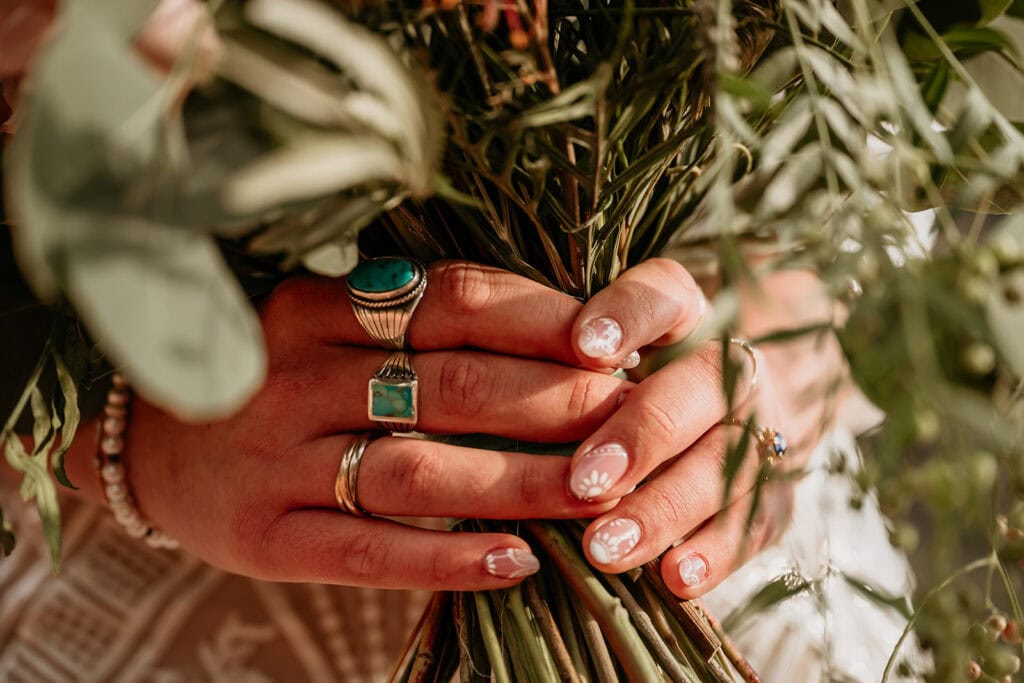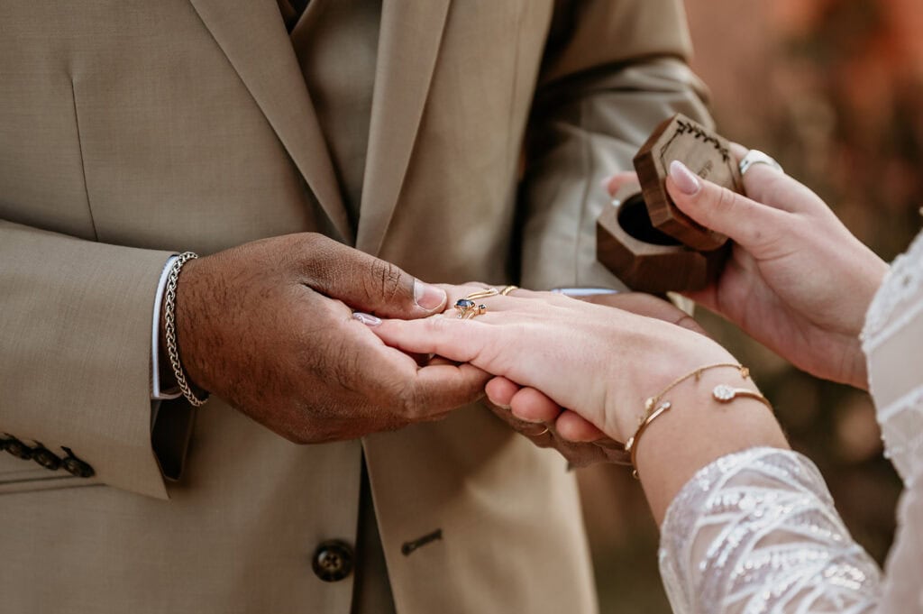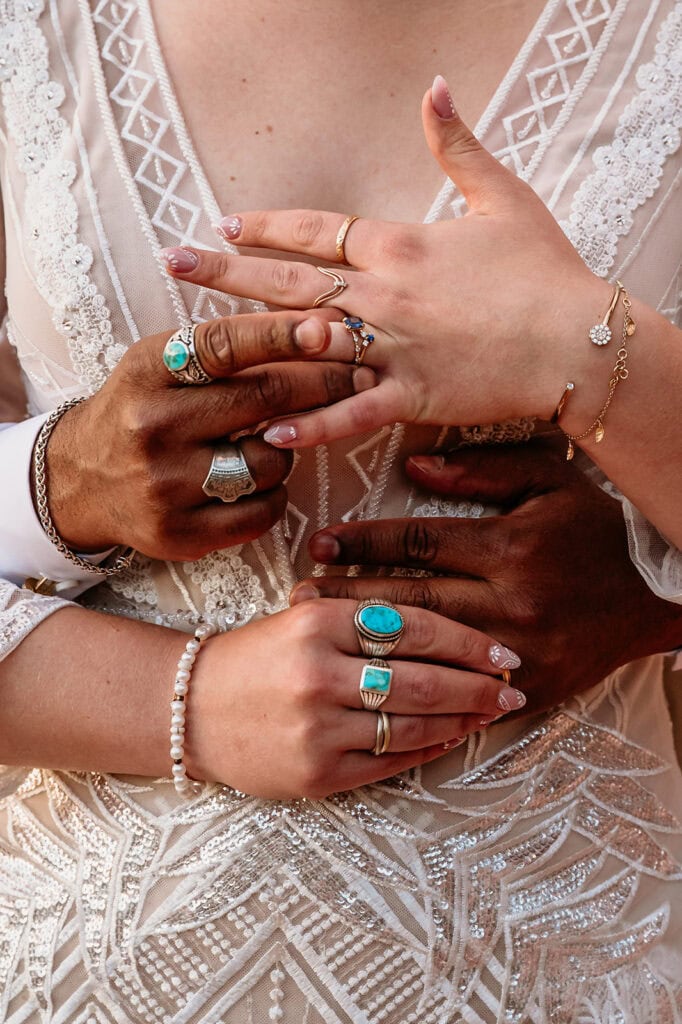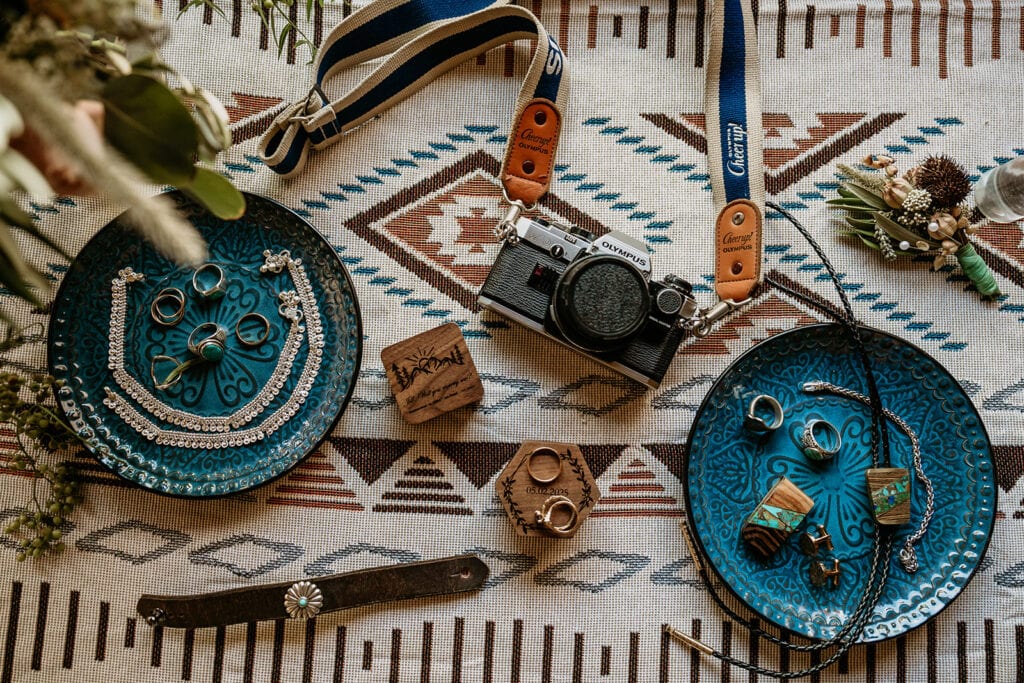 Jillian’s long-sleeved beaded gown caught the early light in the most unreal way, and her turquoise jewelry mirrored her bright blue eyes. Ash from Desert Sage Hair and Makeup styled her hair into soft blonde curls that fit the desert breeze perfectly. Sai wore a tan suit with a bolo tie and vest, a look that nodded to the Southwest vibe they both love.