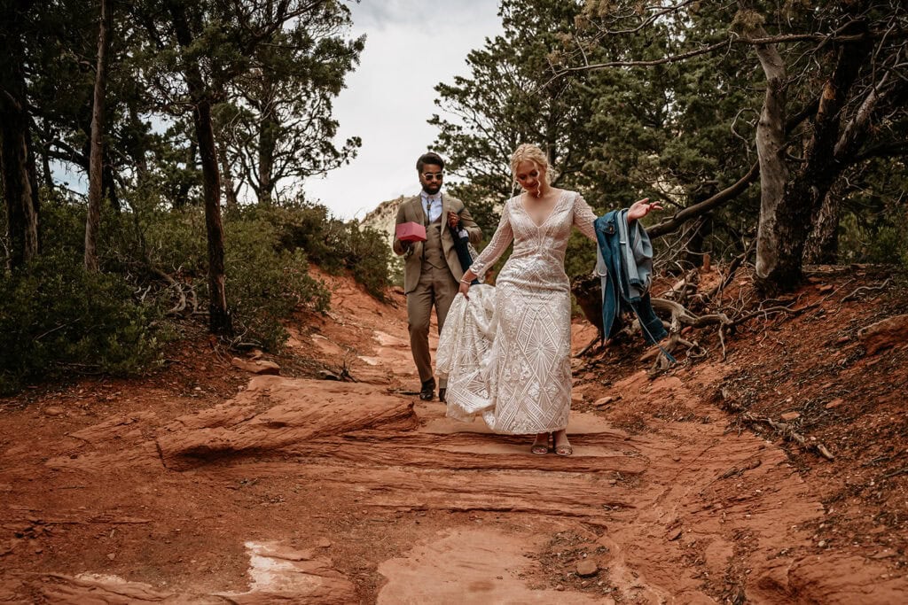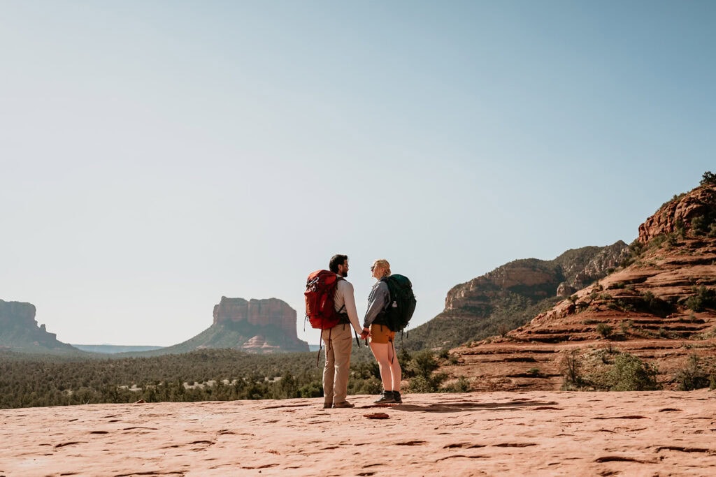 After their vows, we walked over to the main Cathedral Rock ledge for portraits in the warm morning glow. The views stretched endlessly in every direction. On the way back down, we came across a pair of early morning hikers who signed as witnesses to make things official.