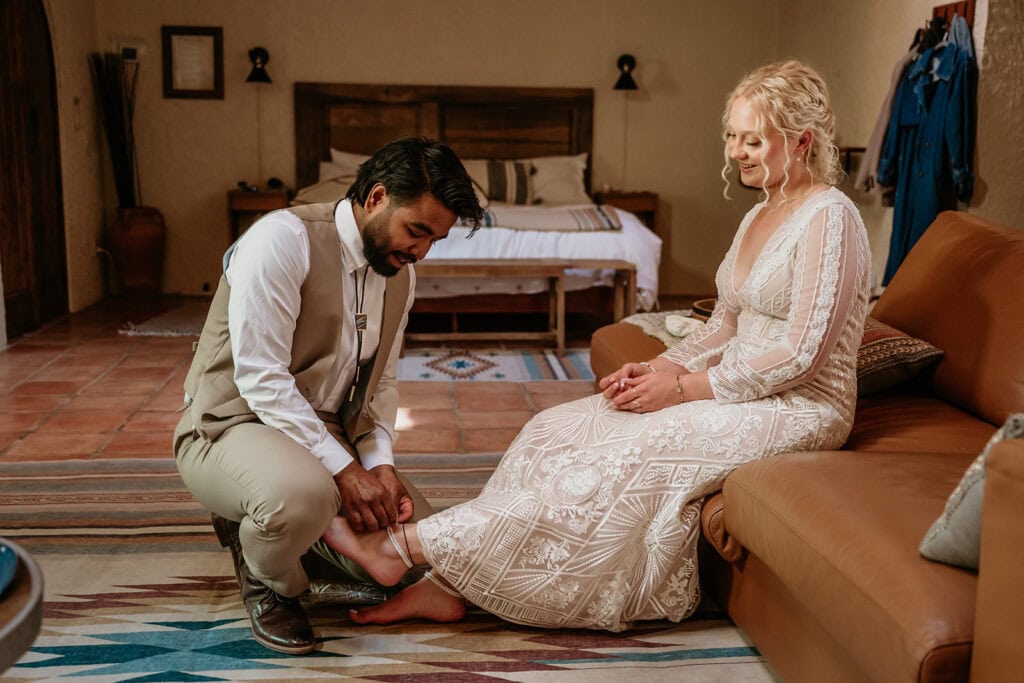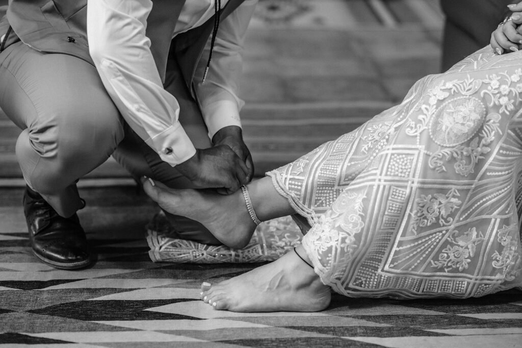 The two took a break during the day before I met back up with them mid-day at their Airbnb. They helped each other get ready again, and Sai placed anklets on Jillian’s ankles, a family tradition that meant a lot to both of them.