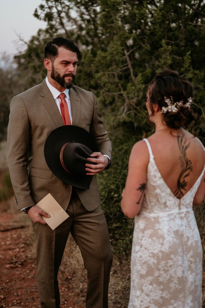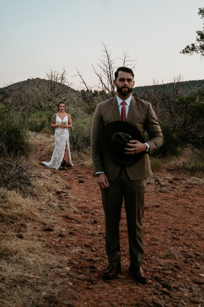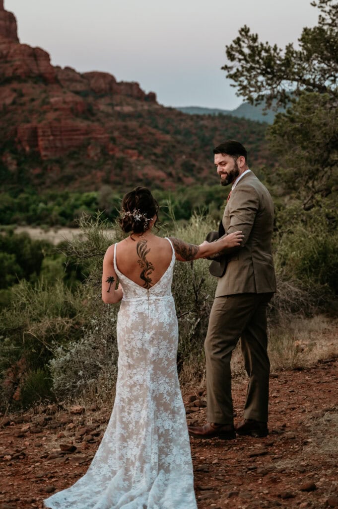 Tiffany and Stuart’s elopement day began just as the sky was awash in soft purples and pinks, bringing out the deep, rich tones of the Sedona red rock. We walked down a short path where they shared a first look and exchanged private vows.