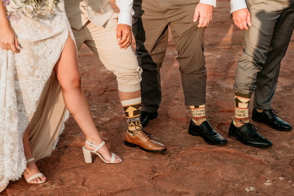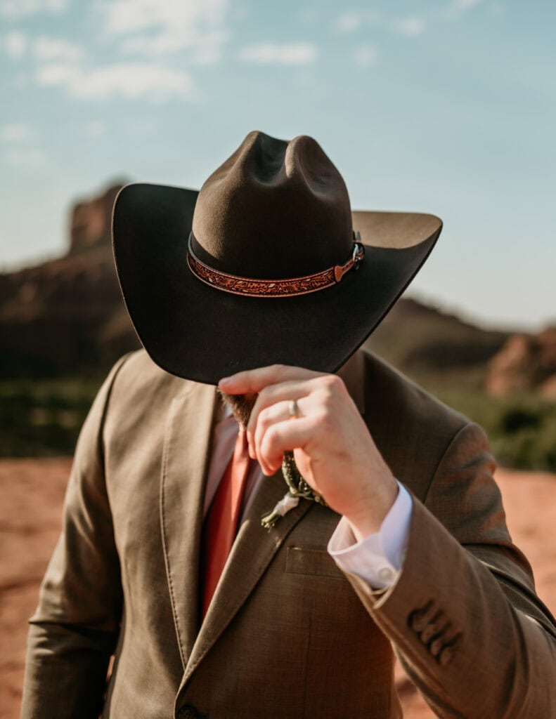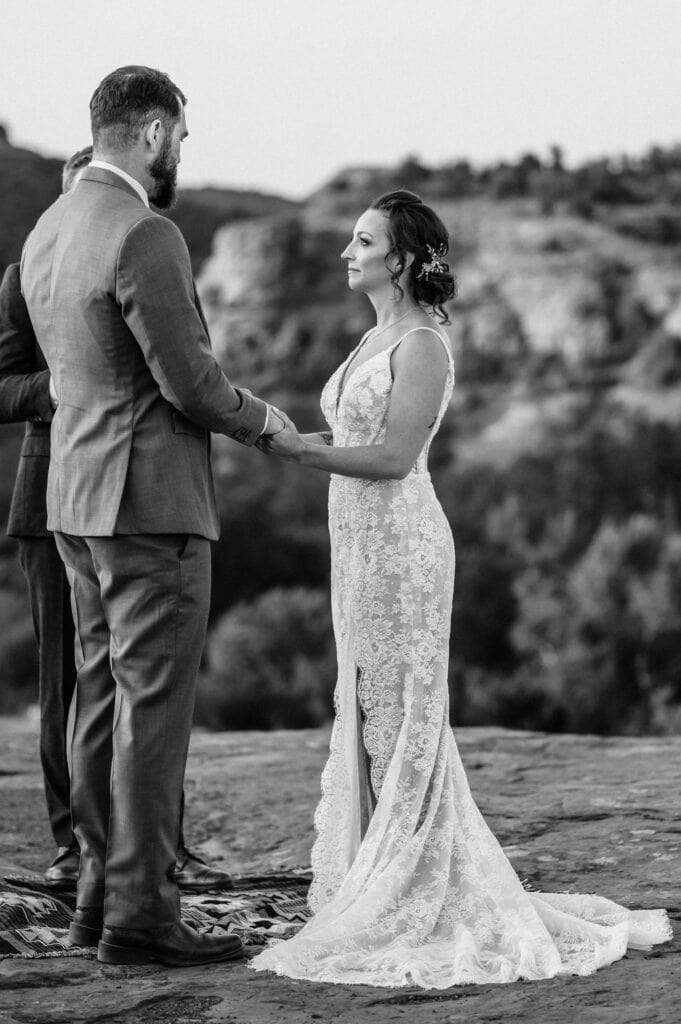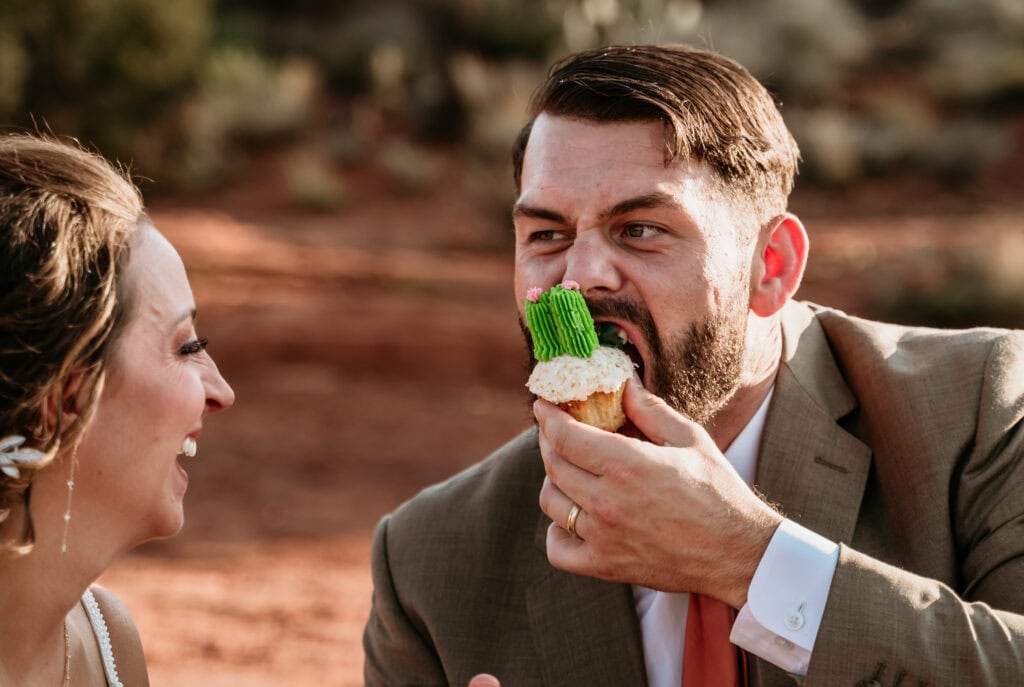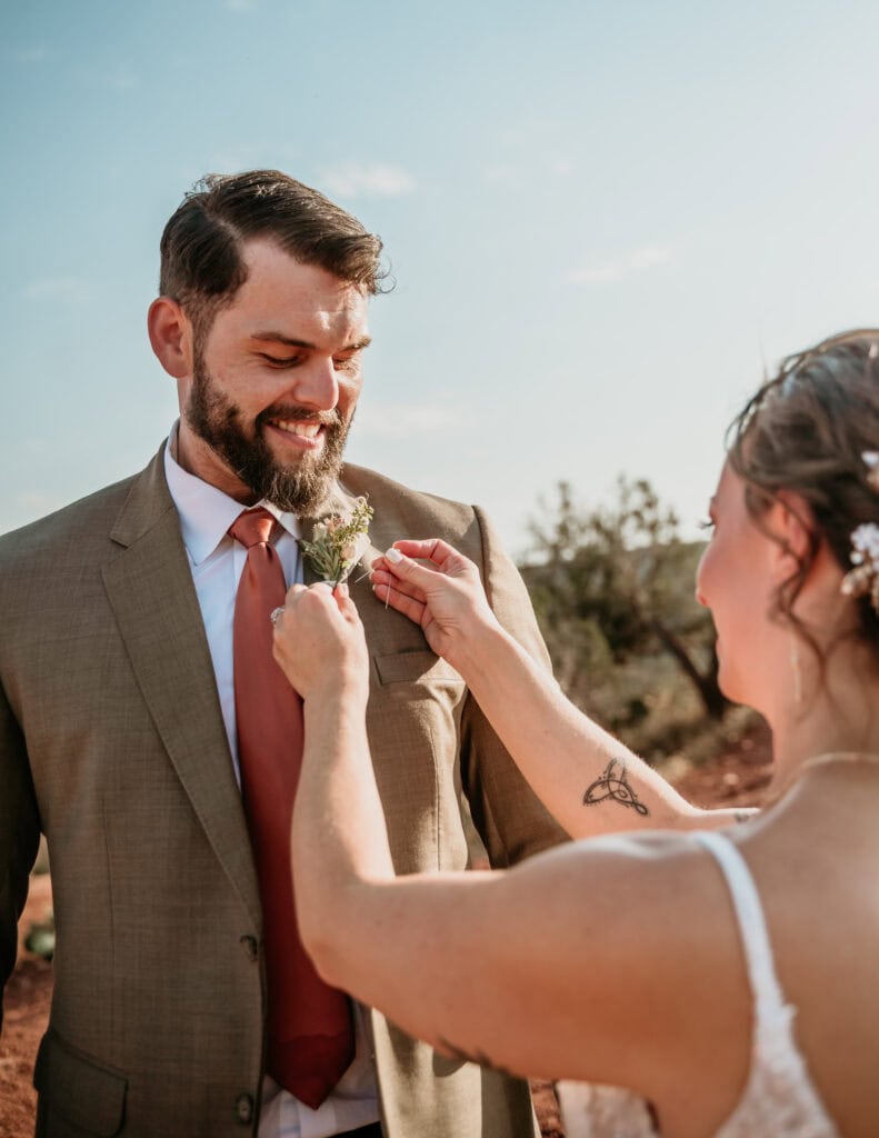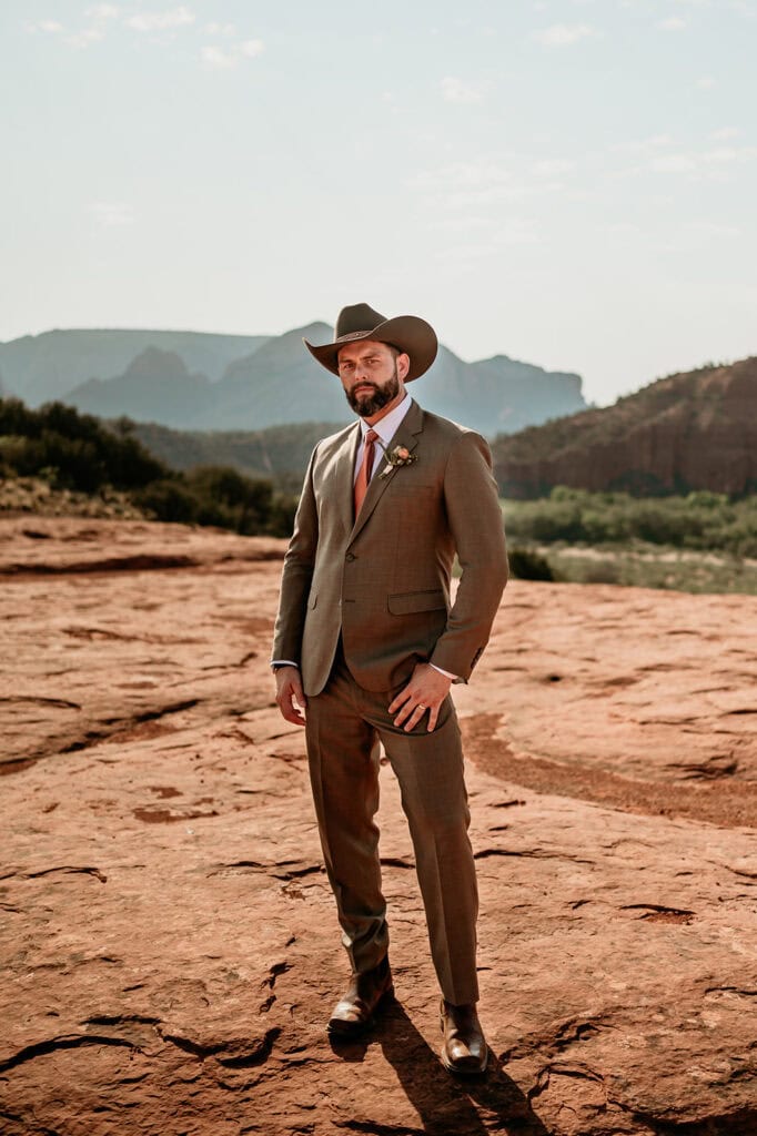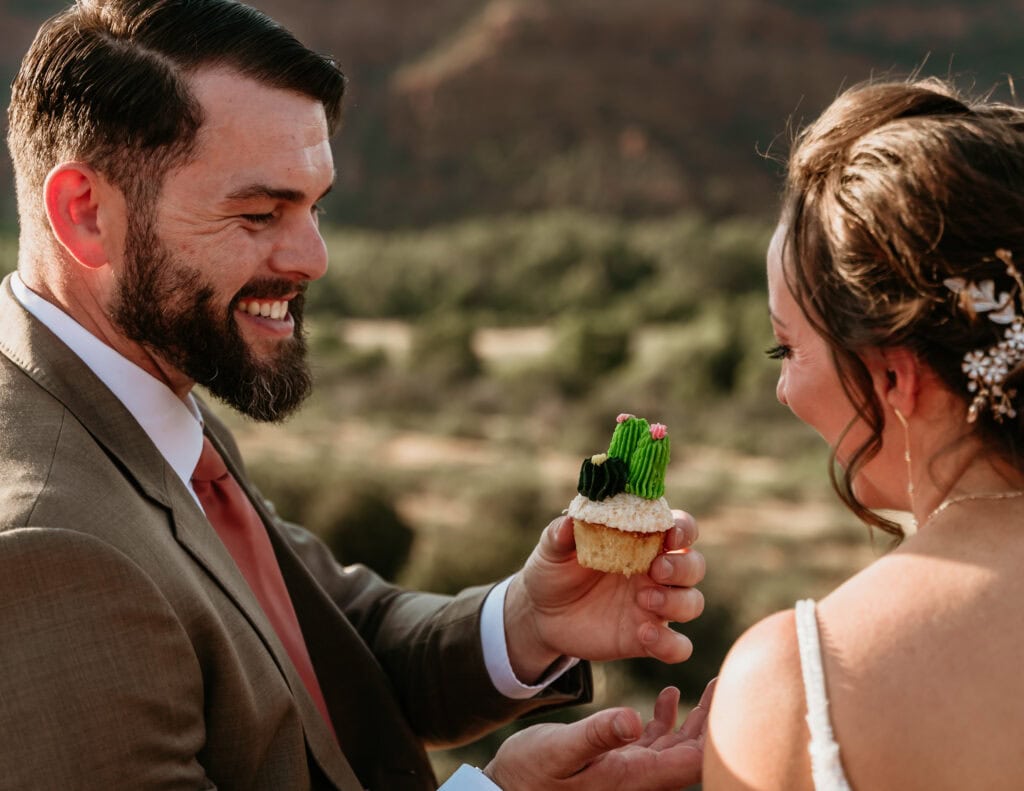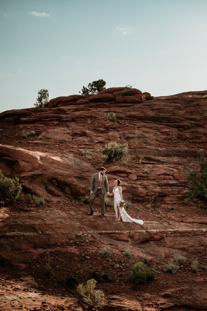 From there, we hiked out with their family to one of my favorite overlooks at Secret Slick Rock, with Cathedral Rock stretching across the distance. Laughing and getting ready with their family was followed by a breathtaking ceremony as the sun crested the horizon. The cooler sunrise temperatures meant everyone stayed comfortable, present, and able to actually enjoy the experience instead of racing the heat. After photos and time together, their family headed off to prepare for brunch while Tiffany and Stuart stayed back to celebrate and take epic nature portraits.