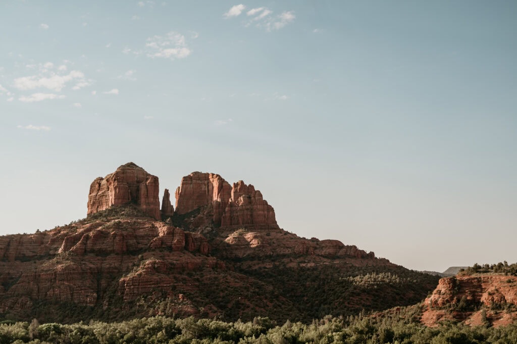 Tiffany and Stuart knew early on that their summer elopement in Sedona would take some thoughtful planning. While summer is generally not advised for eloping with family due to the chance of high temperatures and monsoon storms, their July date was set by Stuart’s return from his work assignment overseas. So, we crafted a day that felt intentional without pushing through extreme heat by embracing an early wake-up call for a sunrise-centered day. When scheduling doesn’t allow an in-season date, sunrise offers cooler temperatures, softer light, and the kind of quiet that exists only before the desert wakes up.