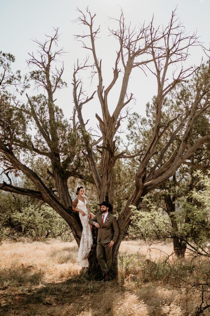 They pulled out their blanket and celebrated by popping champagne and cactus cupcakes. Then we explored the upper red rock area before heading to the creek. On the trail back, we found a unique weathered pine tree that looked like something straight out of an old western movie. We leaned into their southwestern attire and created some amazing old-west style portraits.